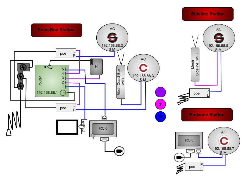 - 1 AC red/white stickered antenna in the end zone to bridge to the pressbox