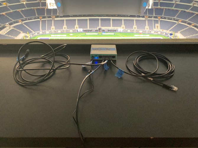 If filming in the birds nest, connect your RCK(s) to the switch labeled SkyCoach. There are two ethernet cables in the switch that can be used. Do not remove the cables from the switch.